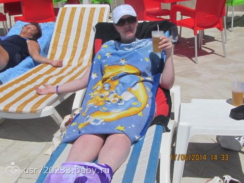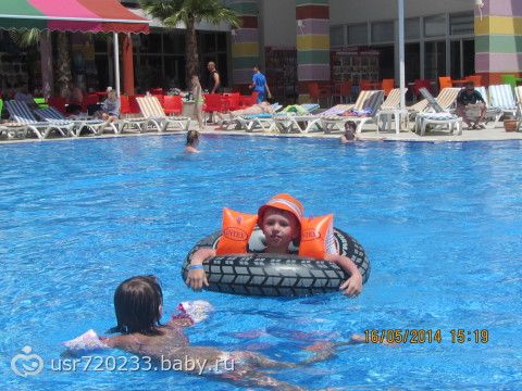 Вот прилетела я домой!!! Впечетлений конечно уйма! Начну по порядку, перед отлетом выпила я успокоительные, в аэропорту зашли в дюти и купили мартини, решили перед полетом раслабиться, в общем в самолет я села и уже нечего не боялась и весь полет спала, проснулась поела и опять до посадки спала.Прилетели в Турции было 7 утра, погода конечно не ахти, солнечно, но ветер холодный, в общем в первый день я даже не купалась.Заселили нас в номер около 12, мы разложились и бегом на пляж загорать, а у меня кожа белая, и я постоянно сгораю, но как говорится до рвалась, и сгорела((((Потом под полотенцем загорала, когда кожа отошла загорала уже под зонтом всегда, но и там умудрилась сгореть, в тени, намазаная кремом.Мотвейка хорошо загорел, его вообще из воды вытащить не могла.В целом отдых супер, онклюзив сделал свое дело((((и я прилетела +5 кг, но нечего сейчас активно начинаю сбрасывать.Ездили в г.Сиде на развалины, погуляли, по базару походили, со всеми торговались, цены везде сбивали от 20%-50%.Ездили на дискотеку в г.Манавгат, на открытие клуба, вот там я девочки была сильно разочарована, нам обещали супер программу, при входе фирменный коктейль, огненное шоу и гоу гоу шоу.Отдали мы за это 15 $с человека, в общем приехали нам при входе подают какую то красную хрень в рюмки, это был коктейль, мы от него сразу отказались, зашли внутрь, а там не большое помещение, посередине стоит барнная стойка буквой П, музыка так себе, огненное шоу, это какие то большие бенгальские огни, гоу гоу, это Турчанка на барной стойки в нижнем белье и ботфордах, ужасно двигающаяся, в общем 3 часа скукоты, ели дождались когда за нами преедит автобус.Больше на дискотеки мы не ездили.Еще одна экскурсия у нас сорвалась, перенесли ее на день отлета, мы отказались, и я с горя пошла и купила себе платье))))))))))Очень впечатлило огненное шоу от наших аниматоров, вот это было супер!!! весь отель им аплладировал стоя, они оказывается еще и йоги, они лежали на стеклах всеми частями тела, сверху на них вставали люди, ну в общем очень понравилось.Еще понравилось их пиво, очень вкусное, легкое, его можно выпить немеренное количество и не пьенеть, что мы и делали)))))ну как всегда я не смогла не отличиться, решила побегать на дорожке, к сведению, но я не разу этого не делала.в общем пришла, включила, настроила охринительную скорость и встала на нее, конечно я с нее слетела, колени в кровь разбила, на ляшки синяк и садина, руку счесала, в общем я потом и плакала и смеялась.Были мы там 10 дней, уезжать совершенно не хотелось, обратный перелет прошел тоже легко, прилетели ночью, муж встретил, Сашульку утром привез от бабушки, он теперь от меня не на шаг не отходит.А еще я покаталась на водных горках, понравилось очень! ну и фот конечно!