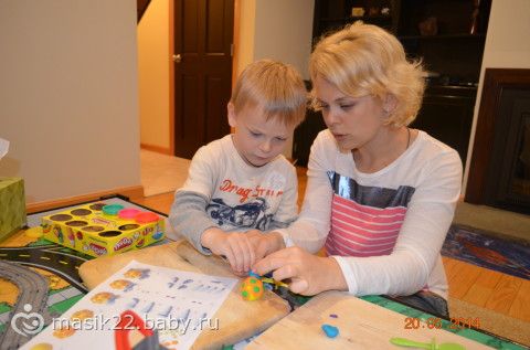 Процесс. Веня сам выбирает фигуру, которую будем лепить. Обычно за раз не больше одной, иначе внимания потом не хватает и превращается все в бешенство и мотание мне нервов. Сначала мы делаем все заготовки, тут не только повторение фигур геометрических, но еще цвета и счета. Он сам достает цвета, которые понадобятся. Потом заготовки, Венька считает, сколько кружочков и какого цвета нужно- повторение счета. Ну, и сам процесс, где работают пальчики, воображение, память. Одним словом, это фан для нас обоих!!!