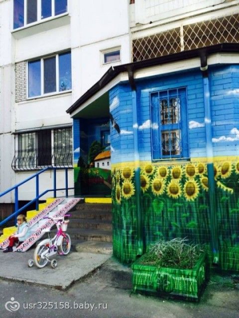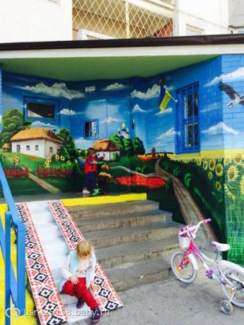 Юлия Герасимович, которая живет к Киеве, решила преобразить свой подъезд. Для этого она наняла мастеров, которые расписали стены подъезда в стиле украинской деревушки. Участвовать финансово в этой затее согласились не все жители подъезда, но Юлия говорит, что сделала это, в первую очередь, для своих детей. В ее планах предложить в районном совете распространить это начинание по другим домам и подъездам