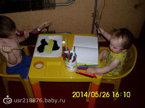 купили деткам стол и 2 стульчика, теперь сидят вдвоем рисуютправда Амалька еще и бодиартом на Наильке занимается, приходиться следить за руками))))
