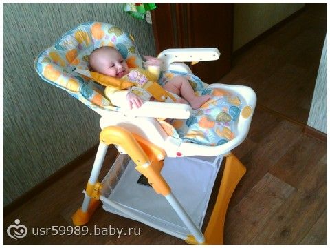В применении очень удобный. Можно было взять и раньше, так как меняет положение спинки. Еще из плюсов: съемный чехол, съемный столик и корзина для игрушек!