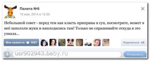 Капец теперь я дома все приправы перетрясла 27 мая 2014 23:54 Комментарии Пожалуйста, будьте вежливы и доброжелательны к другим мамам и соблюдайте правила сообщества ПожаловатьсяСкопировать ссылку Нату-ля-ля Дашуля20 летЕгорушка11 лет Камышин у меня их сейчас полно, уже все пересмотрела, они даже в горчице и жгучем красном перце есть! их там особенно много, я обалдела когда их нашла, ладно приправы и крупы но красный молотый перец, это пипец какая они гадость! ПожаловатьсяСкопировать ссылку Kleo Бусинка10 летЕлизавета12 лет Ростов-на-Дону Я один раз кашку сварила. Жуть. ПожаловатьсяСкопировать ссылку kaTERIna сынулька15 лет Балашиха блин, завтра и я пойду свою проверять, в крупе знаю, что могут образоваться, а вот приправа....... ПожаловатьсяСкопировать ссылку •●•●МилыйДоХтор●•●• Юлия28 летАлександр21 годСофья13 лет Руза У нас прям беда… поэтому у меня все специи в стеклянных герметичных банках...ПожаловатьсяСкопировать ссылку Надюша Ивлиева Сочи У нас и в стеклянных банках заводятся… пищевая моль… тупо не знаем, как ее вывести!!!!! ПожаловатьсяСкопировать ссылку Гульнара Дамир15 летАмир11 лет Санкт-Петербург Я так кашу сварить хотела, а в манке жуки!!! Ладно ребенка не накормила, все выкинула к чертовой бабушке.Вот откуда они берутся???ПожаловатьсяСкопировать ссылку Сердючка Ярослава15 летГригорий11 лет Санкт-Петербург из магазина =)))) зараженное что-то берете ПожаловатьсяСкопировать ссылку Арина Дочка13 летСынок5 летСыночек5 месяцев Липецк нам в гречку какие то жуки заселялись, мелкие, коричневые… пришлось половина круп выкидывать ПожаловатьсяСкопировать ссылку kaTERIna сынулька15 лет Балашиха ПожаловатьсяСкопировать ссылку КиберМАМА Доченька34 годаСынок13 лет Краснодар бе-е-е… тоже сталкивалась......... ПожаловатьсяСкопировать ссылку Наташка Алёнка13 лет Москва У меня раньше в петрушке и укропа вечно жучки были, но только в своём, не в покупных пакетиках )))))) ПожаловатьсяСкопировать ссылку ஐ♥ღСчастливыйПерчик ღ♥ஐ๑♥●•·˙ Елена24 годаВалерия10 летДмитрий14 лет Муром ПожаловатьсяСкопировать ссылку Ольга ❀٠Коржик٠❀ Доченька12 летСыночек9 лет Челябинск Откуда им там взяться то?!ПожаловатьсяСкопировать ссылку Murrcheeba Михаил12 летМария9 лет Москва про пищевую моль слышали? не говоря уже про прочих долгоносиков... ПожаловатьсяСкопировать ссылку Ольга ❀٠Коржик٠❀ Доченька12 летСыночек9 лет Челябинск Нет, не слышала и не видела, ттт ПожаловатьсяСкопировать ссылку Murrcheeba Михаил12 летМария9 лет Москва гадость та еще(( ПожаловатьсяСкопировать ссылку Ольга Талант13 летДжордж10 лет Москва да было дело! жучков куча Предыдущая статьяПро дом 2Следующая статьяЭто пздц!! Куда так худеть то?Актуальные посты4 месячный ребенок не ходит в туалет суткипокажет ли узи сердца стенокардию