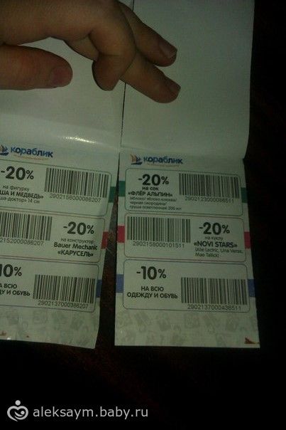 а купоны все разные, кому что выпадет.Нам с подругами выпадал купон где 1. Памперсы Меррис в подарок.2. 20% скидки на планшет для рисования (плюс скидочная карточка у меня была), 3.40% скидки на детскую одежду и обувь.