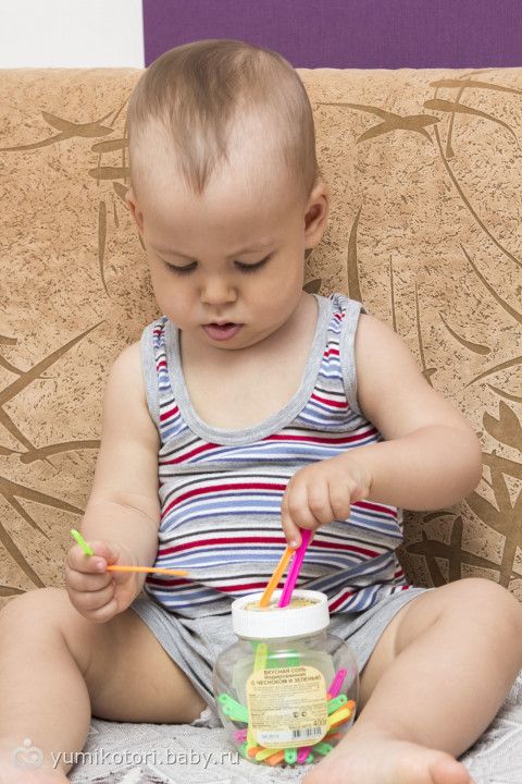 Миша без ума от собирания счетных палочек в баночку!!! Делает это целыми днями с небольшими перерывами! Может целый час просидеть со своей баночкой. Когда все соберет — просит меня высыпать, и собирает по-новой!