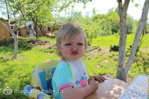 По-поводу речи, у нас прогресс небольшой! Лиза услышала на даче лай собаки у кого-то во дворе и… она стала его повторять. Потом выучили как киса разговаривает, так что теперь мы говорим два слова — «ав-ав или „а-а“ и „мааа“ или „мяяяя“. После этого ее понесло — она болтает на своем языке почти всё время. Я ничего не пойму, но это прогресс, так раньше мы рот не открывали буквально… только гу да гу про себя. А когда звонит нам папа, то она слушает его и ведет с ним диалог „аааа, враплопвк“, „ааа, цщуокгтыл“)) что-то типо того))