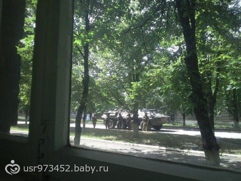 а это сфотографировала сегодня моя одноклассница из своего окна.на фото виден БТР и солдаты с направленными на жилые дома с автоматами..