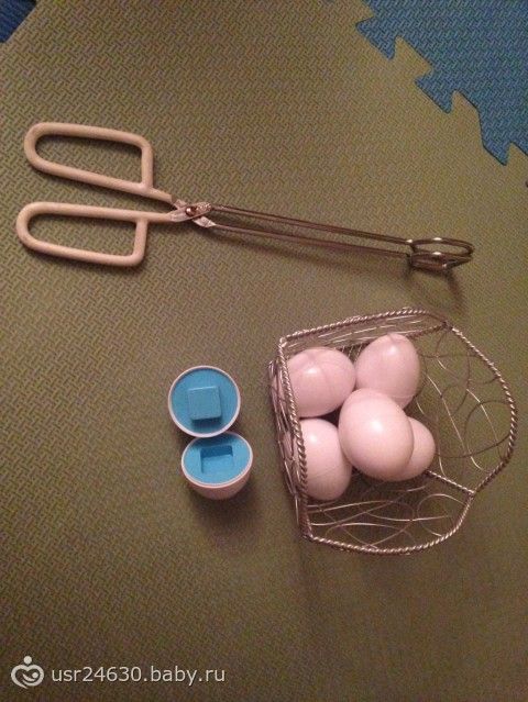 С щипцами другая история. Одной рукой он еще их дерать не умеет, поэтому использует обе. При помощи щипцов мы перекладываем яйца из одной корзины в другую.