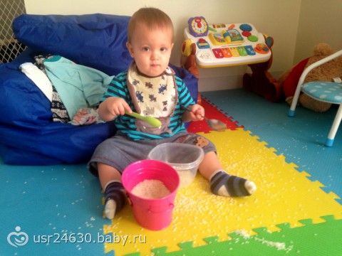 1. Крупы. Интерес к ним еще не угас. Благодаря ежедневной тренировке держать ложку за едой, он пересыпает рис из одной емкости в другую уже почти не просыпая. Увлекает его это занятие минут на 5-10, потом он начинает зачерпывать рис в кулочек и смотрит, как он медленно сыпитсяс из его ладошки. Это процесс менее аккуратный. Далее мы прячим мелкие детали в рис и ищем, но теперь и он их прячет, а я должна искать.