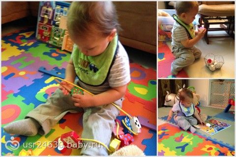 9. Пазлы и картинки. ПРостые пазлы как наш цветной коврик (на фото сверху) ему больше нравится разбирать. Я попробовала тут дать ему разрезанную на 3 части картинку… не понял… видимо еще рановато…