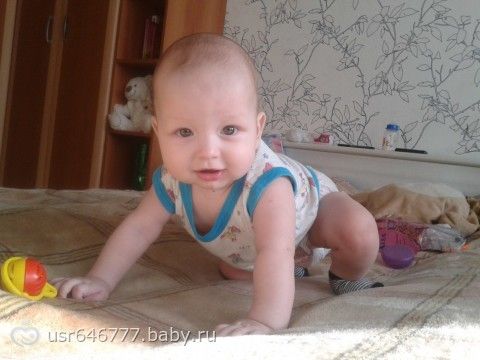 Даже не верится, что пролетело уже почти семь месяцев.Смотрю на Артёма и понимаю, что в нем мой смысл жизни.Он моя любовь, моя радость и отдушина.За эти полгодика мы научились хорошо ползать, вставать от опоры, сидеть пока не хочет, если только на коленках, держась за что-нибудь ручками.Кушаем пюрешки овощные (броколли, цв.капуста, кабачок), кашку гречневую, пьем чаек с шиповником и с фенхелем… кушаем смесь днем, а ночью мамино молочко.Думала когда Тёмка поползет будет немного легче, но нет, теперь нам интересно все, что трогать нежелательно.Постоянно разворачиваю его к игрушкам, а он опять ползет к телевизору, розеткам, проводам.Отойти от него невозможно, из-за этого приходится изредка садить в ходунки.В них он счастлив, передвигается за мной по квартире и смеется.Еще не так давно появилась привычка пробовать на вкус все, интересным таким способом.Подходит, к примеру, к стене, проводит пальцами по ней и сразу руку в рот.))А еще у нас есть два зубика и лезут еще два.Ждем))