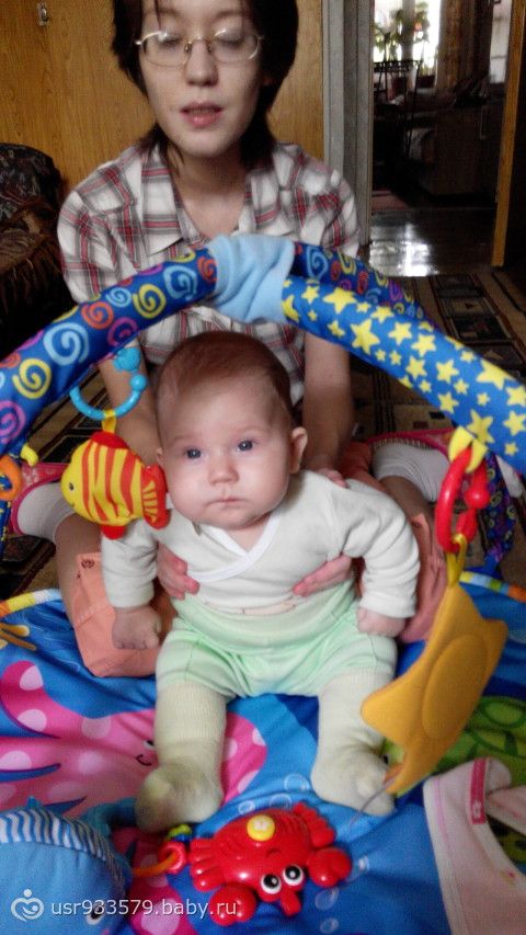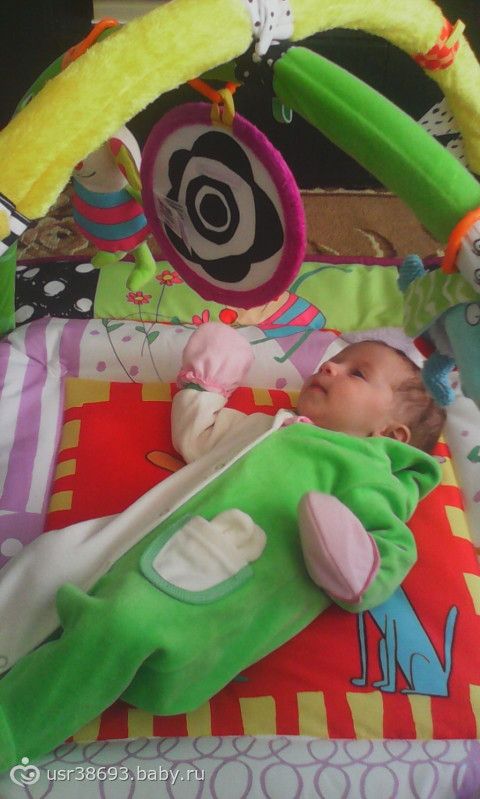 брали у друзей попользоваться, с месяц точно полежал — нравилось) но было уже порядка 4-5 месяцев. насколько я знаю коврик был обычный, с базара, тысяч за 7000 — там висюльки, на них разные звуки и можно было пищать одной из них.