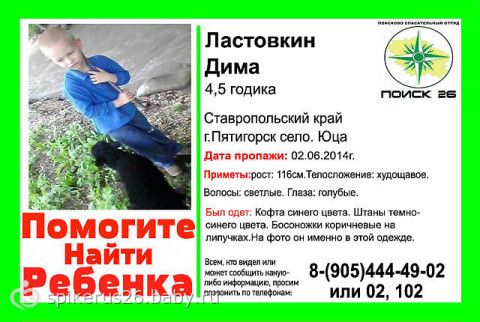#Внимание для жителей КМВ!!! Завтра сбор добровольцев(09.06.2014г.) По поиску #Ластовкина #Димы4,5 годика. #Ставропольский край, г.#Пятигорск село.Юца.Общий сбор в 9.00 в Пятигорске на площади возле администрации. Далее выезд на место.Для тех, кто поедет позже маршрут: с.Юца, Гвардейское прямо не сворачивая никуда по асфальтной дороге, выезжая из села не доезжая до моста последний поворот на право.С собой: питьевая вода, что-нибудь из еды, форма одежды лес. По возможность навигаторы, фонари, скотч.Контакты: Юрий 8-928-337-58-11