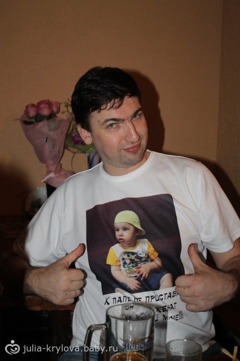 Прикольно) Я своему дарила футболку на которой сзади было написано " Папа Коржика" (домашнее имя сына)), а спереди — фотка сына и надпись " К папе не приставать, он женат на моей маме")