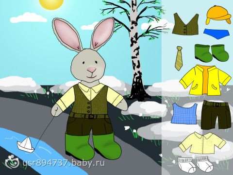 нужно одевать зайку (важен порядок одевания. нельзя надеть ботинки, пока носочки не надеты.)