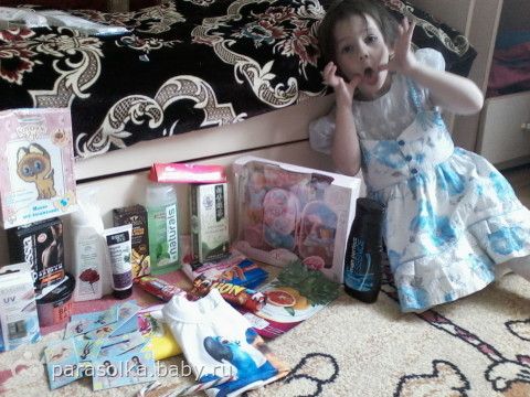 А потом я распаковала и уловила запах тулетной воды «Лакоста». Ну люблю я цитрусовые ароматы! И тут мы с Кирой чуть не поссорились… Потому что она как раз в это время оторвалась от кормления пупса и заверещала: «И мне, и я хочу, и меня побрызгай!!». Потом заявила, что это подарок как раз для нее, поэтому, мама, положи вон туда на столик и спрашивай разрешения попользоваться им. Но взрослые просто так не сдаются и я выкупила туалетку шоколадками, которые вытащила, опять-таки, из посылочки…