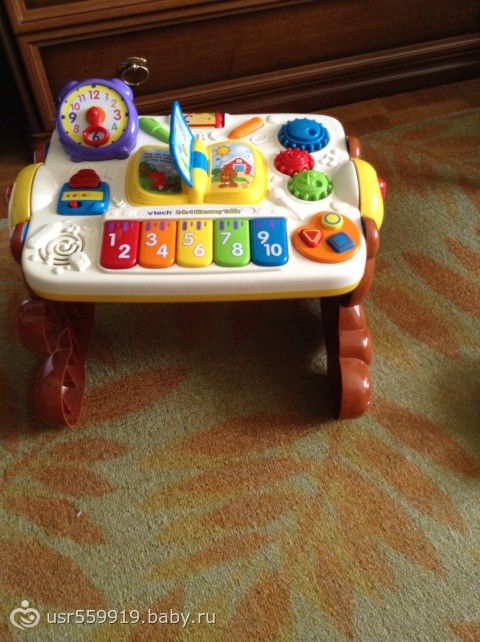 Моей дочке! Кажется я недавно только писала про 8, а уже 9… Крошка моя уже совсем не крошка, а вполне уже дЭвушка))) сколько весит и рост не знаю, но чувствуется что уже не мало, с каждым днем у нее появляются новые умелки, теперь вся наша квартира с утра переворачиваться вверх дном- Лиза ползает с невероятной скоростью, очень расстраивается если закрыта дверь, ей нужно все получить в руки и отправить это в рот, вечером как она уснет я привожу все в порядок, на следующий день все повторяется- такой веселый день сурка у нас наступил))) больше всего дочь интересуют провода, телефоны, тюбики и планшет, как же без него))) игрушки для ее возраста не нравятся… НО на днях у нас появился супер хит- поющий стол) крестный передал по наследству — я от этой игрушки не в восторге- очень неустойчивый, но убрать пока Лиза не видит не успела, теперь дочь все время у него проводит. Стол двухсторонний, поет песни на невнятном английском, дочь просто пищит от восторга, ходит вокруг него кругами и пищит)))) вот это чудовище: