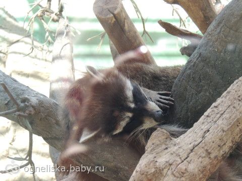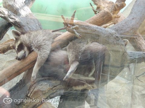 в зоопарке при дельфинарии крутые еноты спящие валетом друг на друге вид спереди