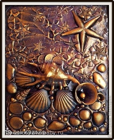 В общем решили мы с мужем спальню в черно-белых тонах сделать, причем 2 стены более темными обоями поклеить, а две более светлыми. Так вот я задумала сдела 2 интерьерные картины из ракушек, одну в натуральном цвете и на светлом фоне, а вторую вот такого плана, т.е как состаренную в цвете бронза