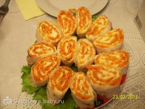 1. Лаваш с морковчой и сыром. Ингридиенты: лаваш, сыр плавленный Орбита, чеснок, майонез и морковча. протереть сыр на крупной терке, перемешать его с майонезом ит чеснов, выложить на лаваш не очень густо чтоб и сверху морковчу корейскую, тож не очень густо. Можно еще добавить укроп-петрушку.