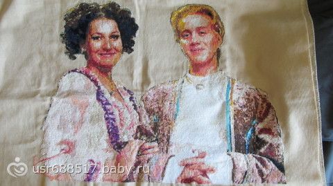 а это сделала схему с фотографии себя и своего любимого почти в натуральную величину, вышиваю уже 2,5 года, готово процентов 50, сейчас маленько затормозился процесс — нигде не могу найти подходящие оттенки… фон будет темно-темно синий и арка из цветов, вышитых лентами, кое-где прицеплю стразики