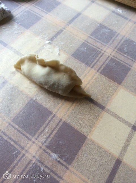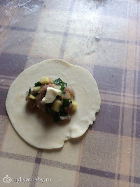 И начинаем готовить! Отрезаем от теста небольшие кусочки, раскатываем в лепешку, на серединку выкладываем начинку и маленький кусочек сливочного масла