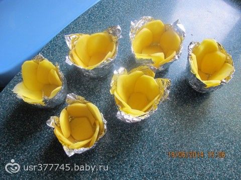 Потереть сыр на терке, добавить желтки, посолить и взбить в однородную массу. Влить по 1-2 ст. л. в цветки.