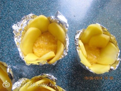 Картофель очистить и нарезать тонкими пластинами. Взять формы под кексы и выложить в них картофельные пластины в виде цветка.
