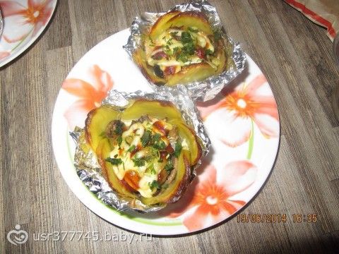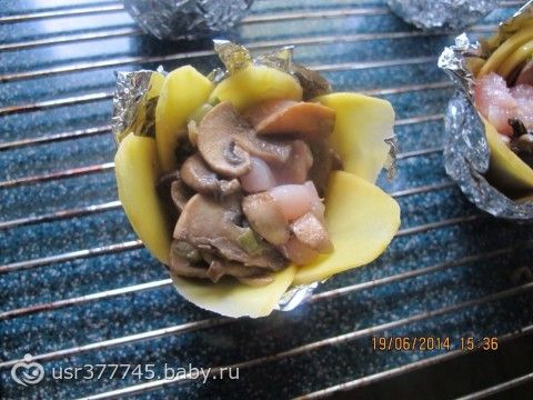 Нарезать грибы, обжарить на сливочном масле с луком, посолить, поперчить. Смешать с мелко порезанной курицей. Выложить сверху сырной массы начинку. Картофельные лепестки смазать подсолнечным маслом.