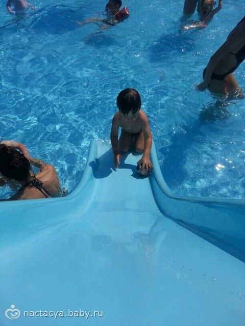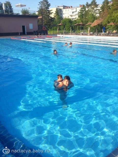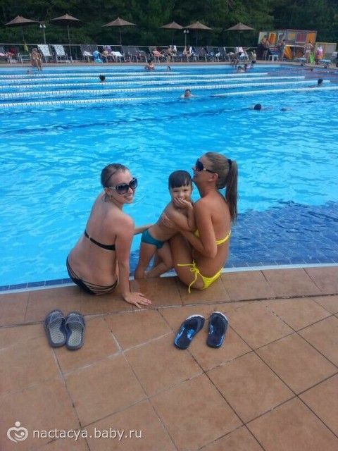 В субботу мы поехали уже около 4 вечера туда — народу было много, не то что в будний… лежаков ооочень мало было свободных, но и народ быстро достаточно к 18 начал расходиться по домам… мы были там до самого закрытия. Артюха накупался — даже с папой купался в большом бассейне — на шее у папы)