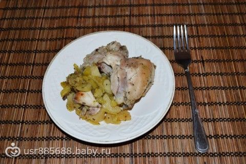 В следующий раз немного иначе делать буду. Бедра + грудка + овощи. Грудка часть жира в себя впитает, не будет очень сухой и овощам жира меньше достанется)