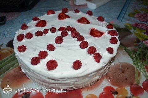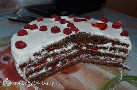 2.Шоколадный (как назвала его Света-думаю, таким он и останется, хотя возможно рецептура потерпит изменения)- насыщенные шоколадные коржи+ нежные взбитые сливки (растительные, можно даже худеющим:-)+ягоды(клубника, малина)