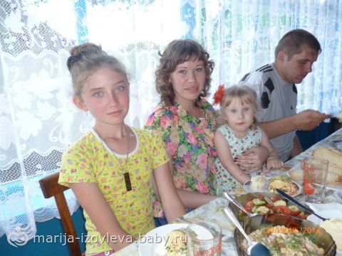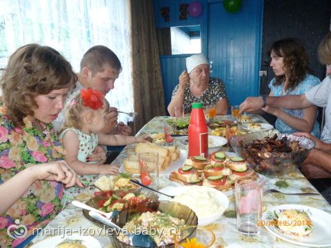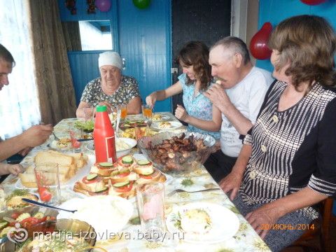 20 июня, утром, мы поехали в деревню к родителям нашим (мы с мужем с одной деревни) отмечать ДР.Приехали, приготовили парочку салатиков, нарезку, позвали родственников остальных праздновать!!! Слева на право: муж Денис, его бабушка, моя родная сестра, папа и мама мои)))