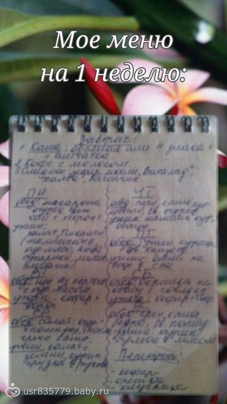 3. Меню на неделю. Тут у меня возникли сложности, т.к. всю неделю в разъездах + у дочки было день рождения, но я напишу примерное свое меню, когда я дома.
