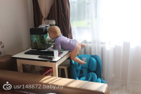 Фотка, где дочка лезет к аквариуму классная, не пойму, она туда залезла по автокреслу?