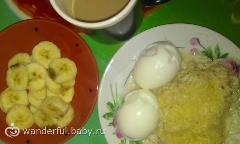 Завтрак: Геркулес под сыром, два вареных яйца, кофе с молоком, ксилитом и банан