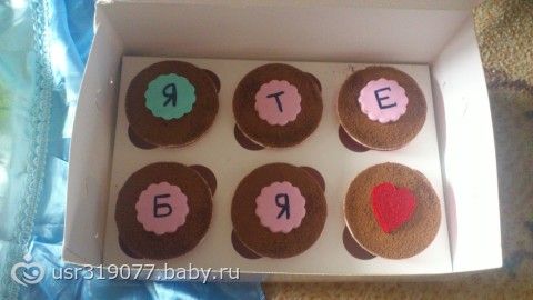 » (сердечко в конце). Она сказала что без проблем все будет сделано в лучшем виде. Состав выбрала: шоколадный кексик с начинкой тирамиссу. Итого стоимость обошлась мне 200руб за штуку = 1200 + 150 коробочка + 300 руб доставка (ребенок приболел поэтому с доставкой попросила) = 1650 рубликов. Договорились с доставкой изначально с 9 до 14, т.к. я думала что муж будет работать а он взял выходной, заранее попросила привезти по возможности по-раньше, она вчера спросила: «к 9 нормально будет?» я согласилась. Итог: привезла к 11 часам, утром написала что вчера вырубили свет у нее и доделывала у мамы. Состав она изменила как она написала (цитирую): "Я немного другие сделала, вкуснее)там прям как десертики тирамису. Очень нежные заложила крем в пироженое само, как десерт тирамису классический и покрыла шоколадом тертым.все это пропитано итальянским кофе". Ну думаю да и ладно, лишь бы были вкусные, я человек не конфликтный, спорить не стала. В итоге она приехала, привезла заветную коробочку, причем взяла ее расписала