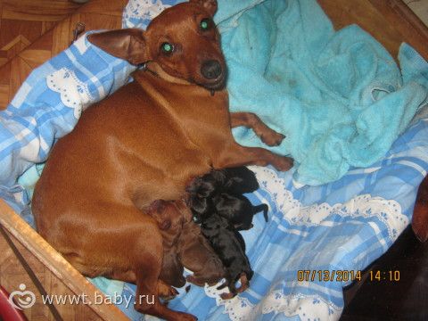 Есть у нас собака, цвергпинчер, которая должна скоро родить, примерно через недельку.Утром мы втали, собрались и пошли с друзьями в кукольный театр. Приходим домой, но нас никто не встречает, я зову собаку, в ответ тишина, только слышен приглушенный писк, захожу в комнату и вижу вот такую картину))) Наша Ассоль родила пятерых щенков))) А я то переживала, как роды буду принимать!!! Вот так )))