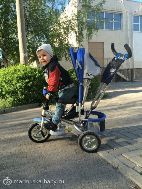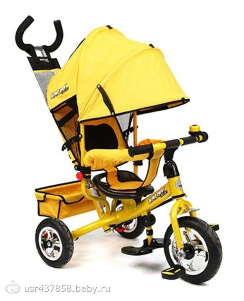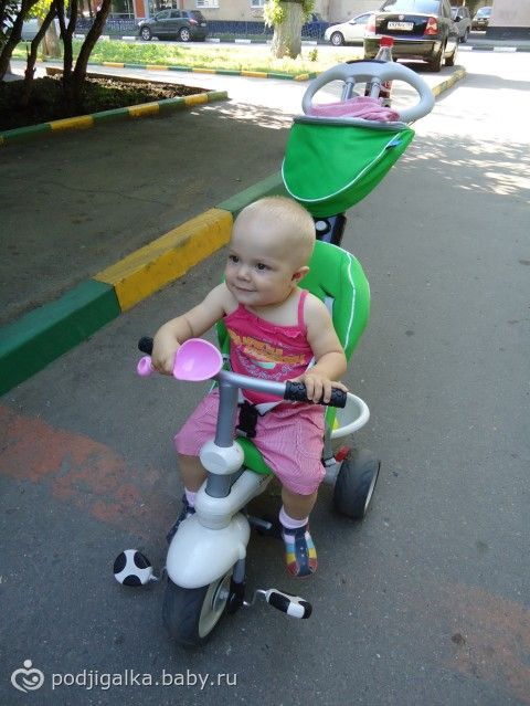 нам на годик подарили вот такой, только на нем написано «самое лучшее время» цвет зеленый (правда он идет от 1,5 так что мы еще на нем не катаемся, до подножки не достает), он тяжеловат по сравнению с коляской прогулочной, а спинку кума специально выбирала такую, просто если ребенок уснет, то он будет спать не на руле а в нормальном положении