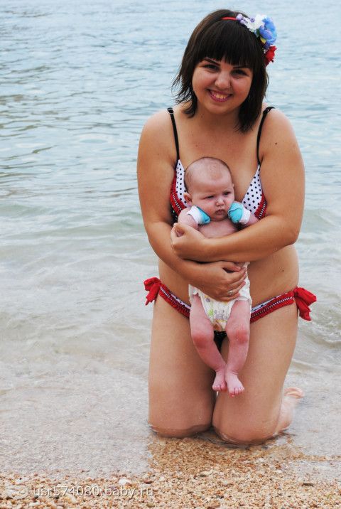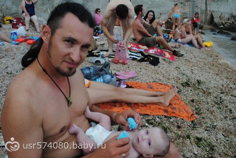 А во-вторых, мы наконец-то дошли до моря))Втроем)Для дочки то было первое знакомство с морем, окунуть я ее пока не решилась, вода для меня уже хороша, а для неё-холодновата… Муж в такую воду тоже не полез)А вот ножки намочить вполне можно)Маргарита не возмущалась, не плакала, но её лицо говорило само за себя)