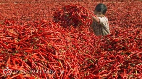 Мальчик складывает красный перец чили в кучу для изготовления порошка на ферме. Ахмедабад, Индия.