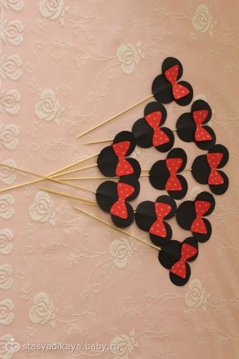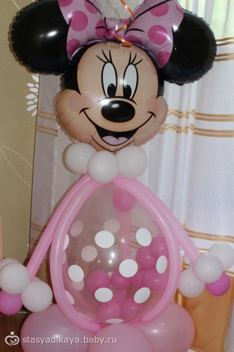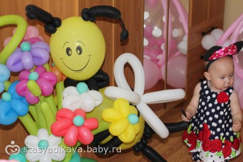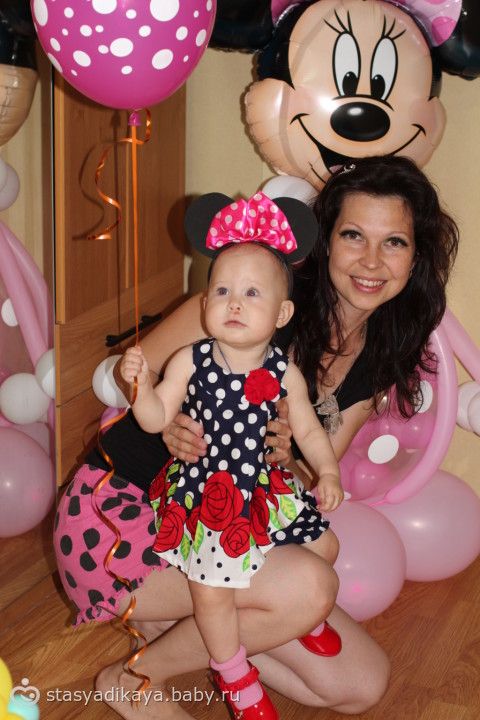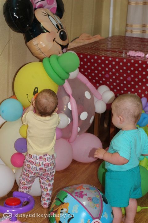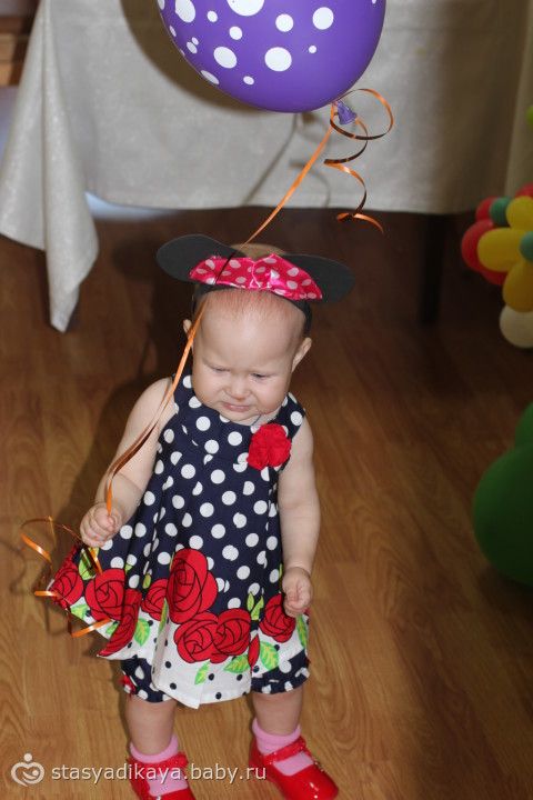 Вобщем, День рождения был оформлен в стиле Минни Маус. Соответственно Женечка была с ушками. Отмечали мы у моей бабушки и комнату заранее украсили шарами, композициями из шаров, растяжкой, плакатами и прочей атрибутикой. Гости заранее получили пригласительные тоже с ушками )))