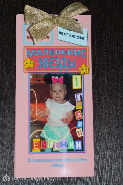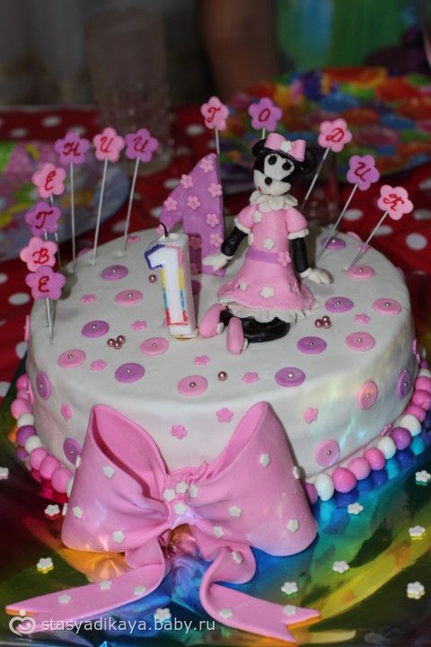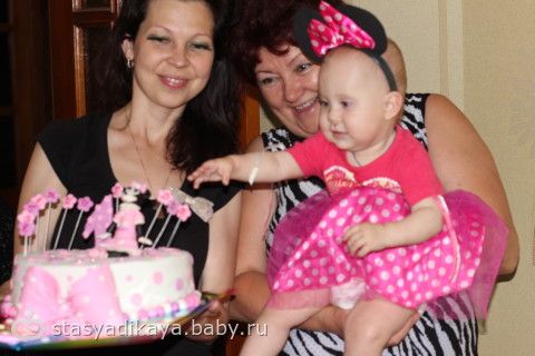 и обряд пострижин (крестный положил денежки под подушку, а крестная срезала крестом волосики). Дедушки, бабушки подарили лошадку-качалку, машинку-каталку, конструктор, и всяку всячину интересную. Мы с мужем купили песочницу, т.к. после поездки на море поняли, что очень любит песочек )))) Было 2 торта, обычный Наполеон и украшенный красивый тортик (правда не совсем то, что я хотела, минни уж больно странная вышла у мастера , муж меня всё смешил ею). Свечки задула я за дочу. В завершение празднования я всем гостям вручила буклетики от Женечки на память.