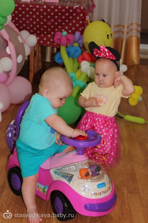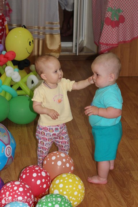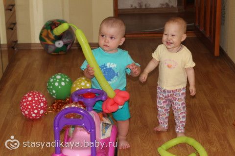 А на следующий день к нам еще пришли друзья с сыночком Женюлиного возраста, подарили ей клоуна из воздушных шаров и собственноручно сшитый прекрасный комплект (платье летнее, шортики под него, панамочка и повязочка). Так приятно! Малыши опробовали оба машинку-каталку, подергали за нос клоуна, ну и просто играли, пока мы пили чаек. Женева как всегда норовила потрогать Егорку, а он кряхтел, пыхтел так смешно )))))