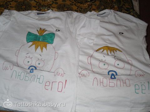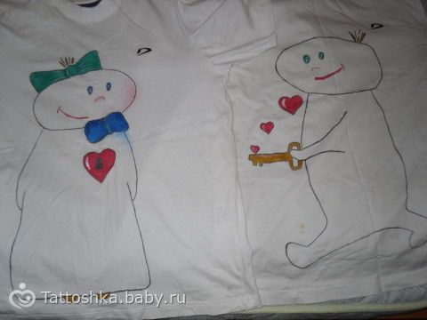 Роспись маек на свадьбу друзьям и себе с мужем(муж уже пятно посадил, другого фото нет, к сожалению).