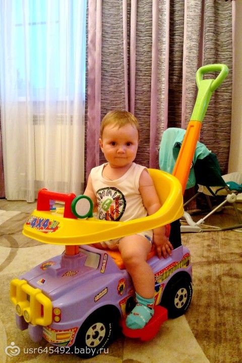 Каталка нравится. Сидит в ней, как вкопанный))))) Ну это пока! Я его катаю, он закреплен, не вывалится. А потом все ненужные пластмаски открепляются, мелкий сам уже будет ногами отталкиваться и гонять))) Для дома и двора-самое то. Но для прогулок, конечно, что-то еще нужно. Так как пластиковое всё, дребезжит по камушкам, просто капец