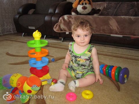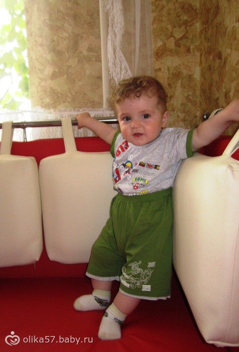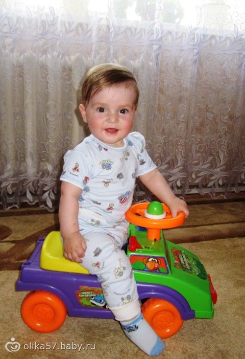 Ползать так и не научился, становится на четвереньки и сразу же плюхается на живот, сидит хорошо, правда ему это уже неинтересно. Очень любит ходить, стоять, вытаскивать провода, с огромным интересом играется с машинкой каталкой, больше всего его интересуют колеса.
