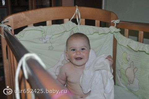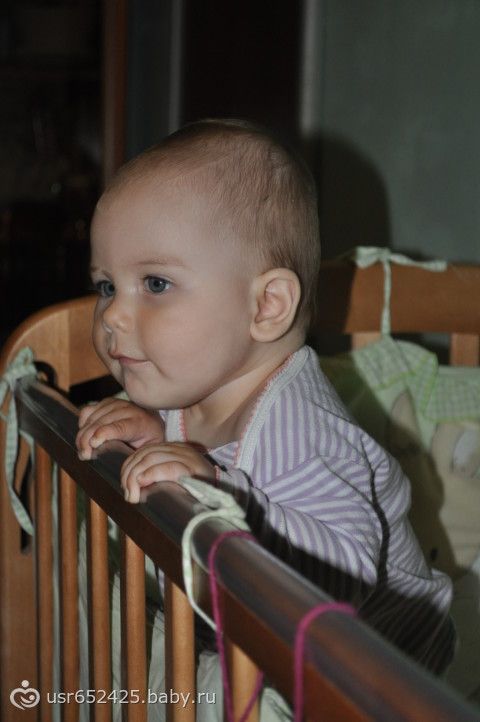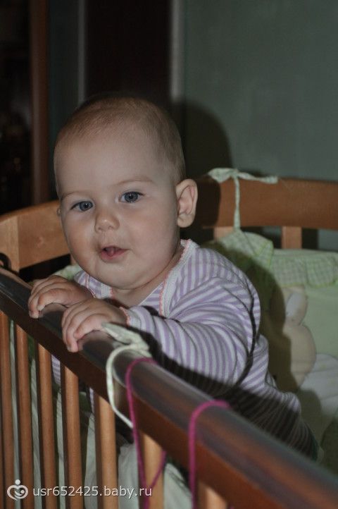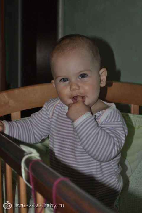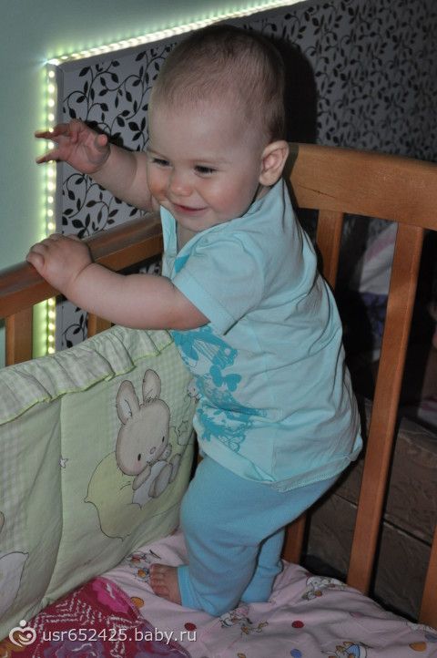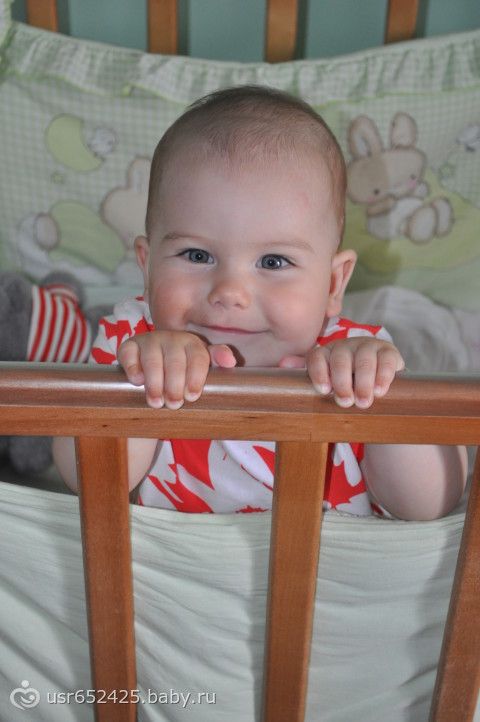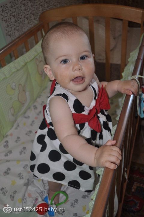 ), играет в ладушки, показывает ежика, отлично ползает, встает в кроватке и передвигается с опорой, дает пять