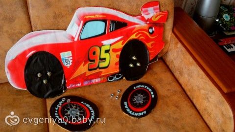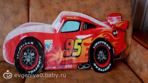 А это для конкурса «шиномонтажка», детки должны были прикрутить колеса и у них это очень быстро и легко вышло, папа и дедушка вырезали машинку из osb, а я обклеила ее, картинку заранее нашла в инете и распечатала в типографии.