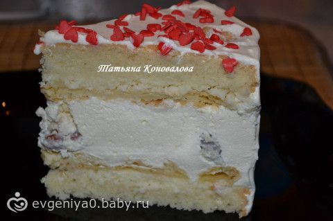 Вот фото торта с нашей начинкой в разрезе, правда у нас такой фотки не было, поэтому я вставляю фото со странички девочки, которая его делала. В нем пломбирный крем с миндалем и кокосовая прослойка.