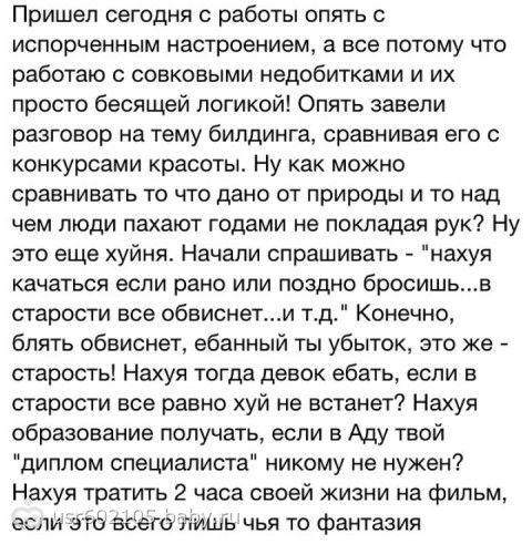 ох, да задолбали со своими "*уй не стоит", печень отвалится, а зачем качаешься, а ты в натураху… )))